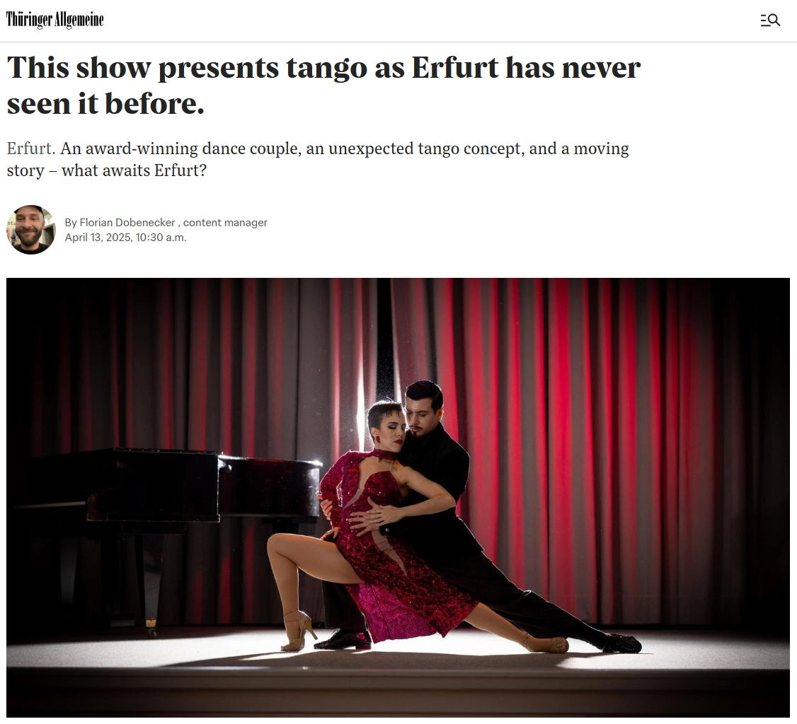 "Heisse Tango-Show bringt Argentinien nach Erfurt" „Mit einer leidenschaftlichen Performance und einer modernen Interpretation des Tangos begeistert das Ensemble von Tango No Limits das Erfurter Publikum und schlägt eine kulturelle Brücke zwischen Südamerika und Deutschland.“ — Thüringer Allgemeine